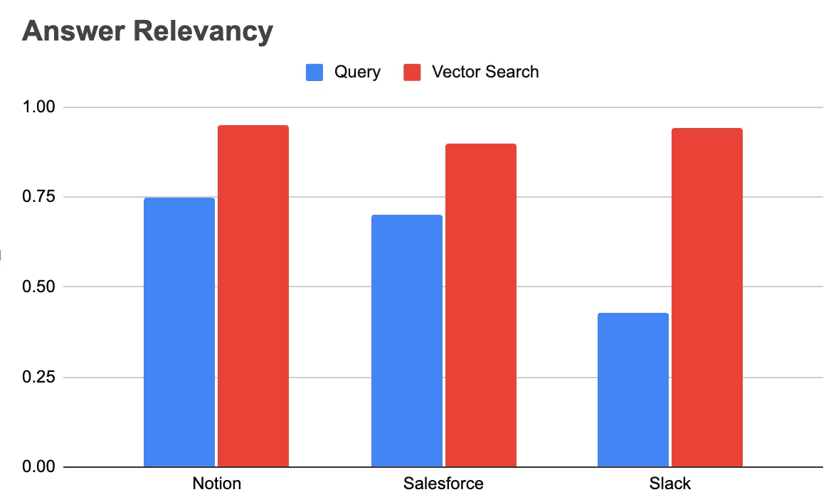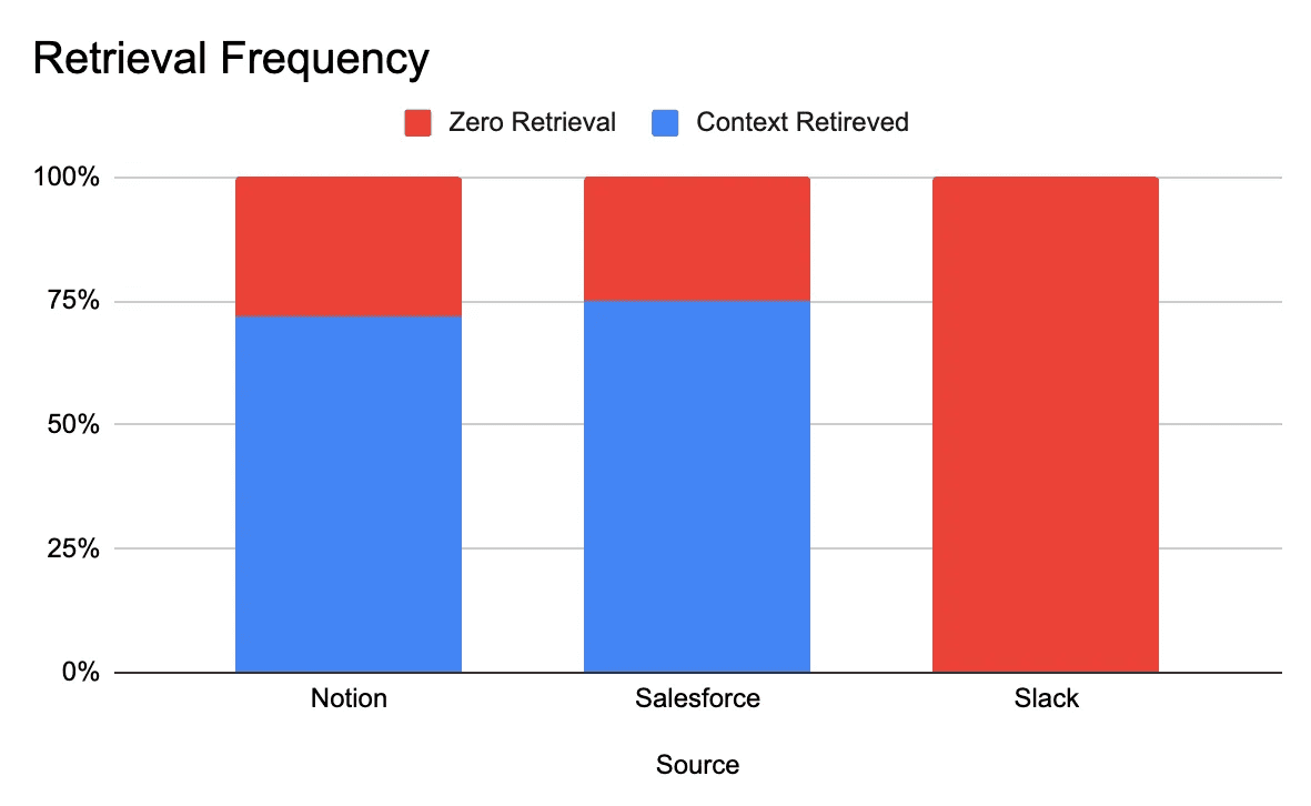 Our RAG application’s ability to query Slack was nonexistent, whereas the ability to query Notion and Salesforce was fair. In contrast, vector searching retrieved context 100% of the time.