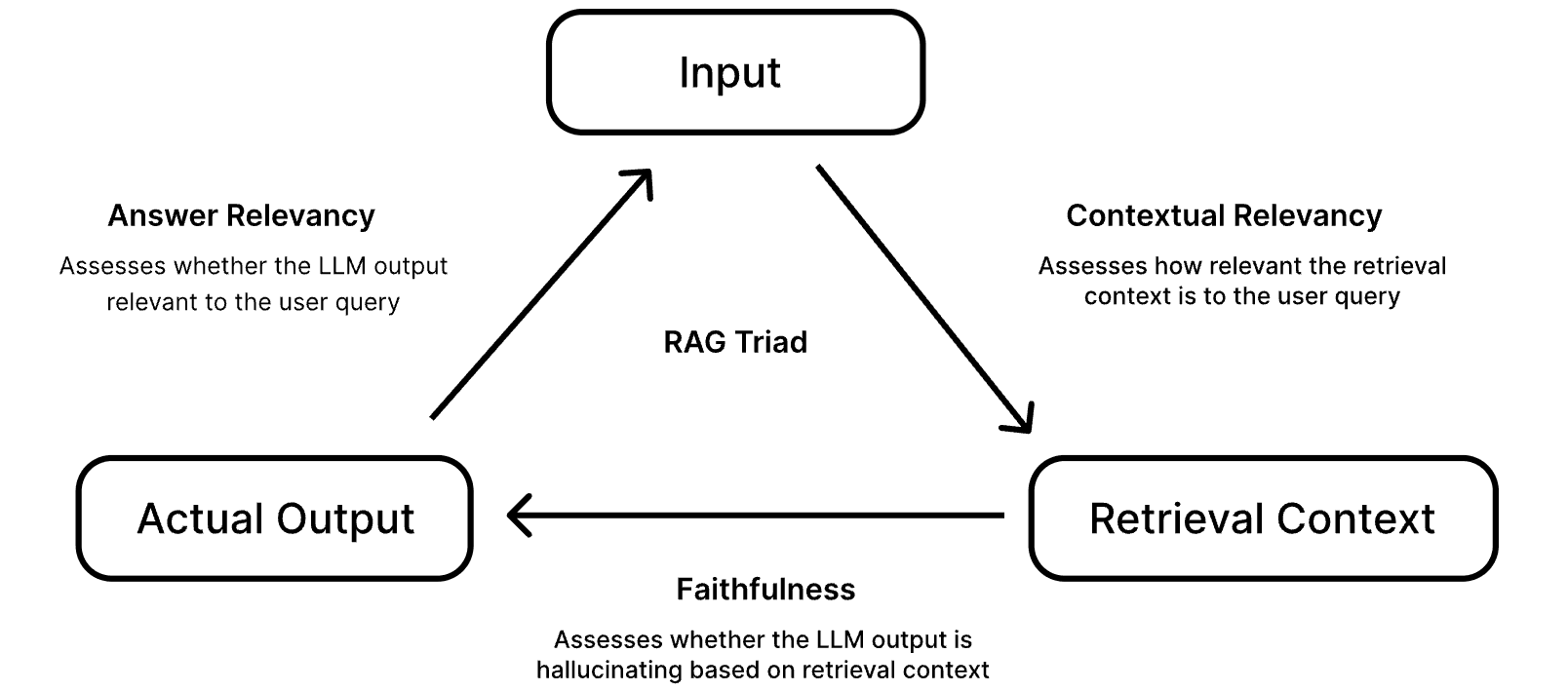 Lastly, we used DeepEval’s evaluation library methods to calculate our answer relevancy, faithfulness, and contextual relevancy metrics.