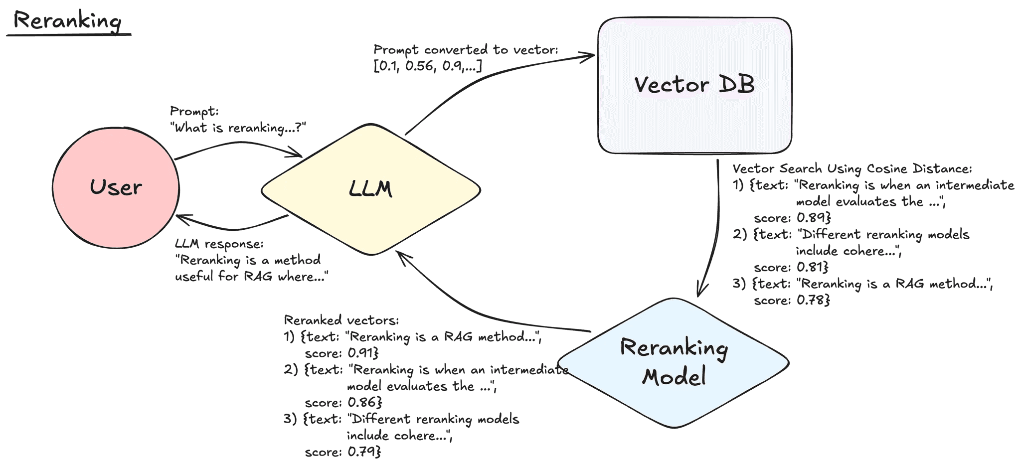 Reranking is an optional step in the RAG workflow where after vectors are retrieved and ranked by their vector similarity metric (cosine distance, dotproduct, etc. are all metrics that measure how semantically similar 2 vectors are), a model evaluates each vector for their relevancy and re-ranks the vectors before giving them to the LLM for answer synthesis.