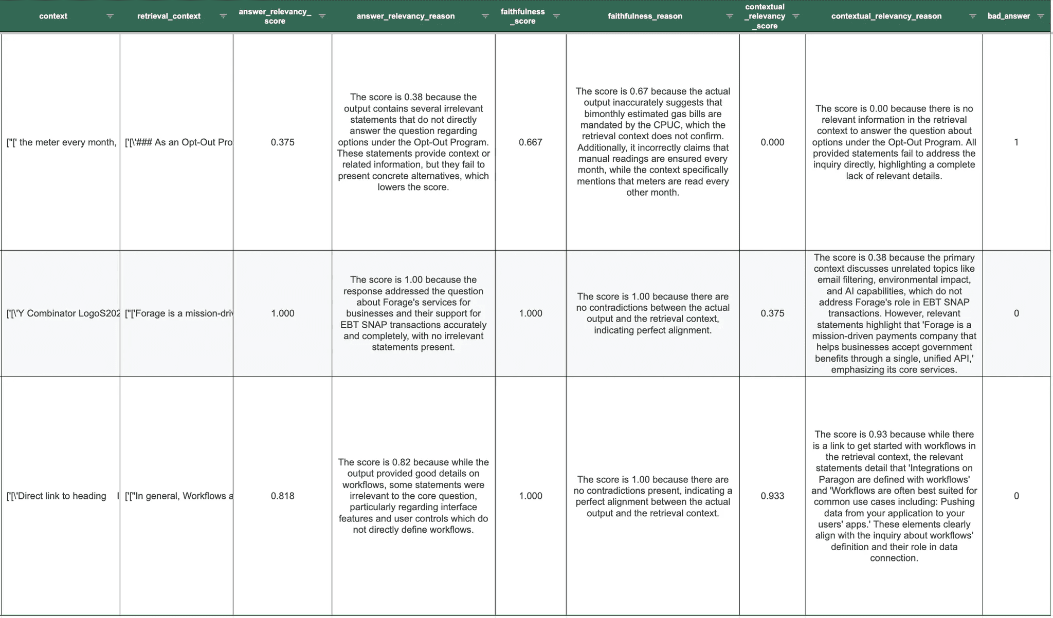 For each test case, we also have the expected context that answers the prompt and the actual context retrieved by our RAG workflow. Lastly, we have our evaluation metrics with generated reasoning for each metric.