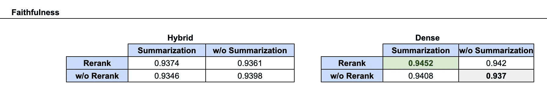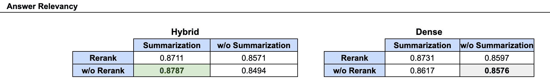 Looking at faithfulness and contextual relevancy, we actually see the dense retrieval, reranking, summarization combination achieve the highest scores, signaling that dense vector search has the highest impact on faithfulness and contextual relevancy, and that reranking and summarization have positive impact. Hybrid search still uses dense retrieval which helps explain why answer relevancy is not greatly impacted by less relevant context and faithfulness to the grounding context.