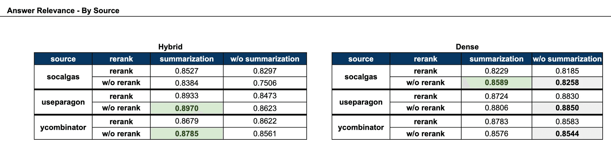 In this study, we wanted to evaluate if these overarching insights from these academic resources apply to more SaaS relevant use cases. Additionally, we wanted to identify the most impactful combination or RAG response relevancy, utilizing a grid search analysis where we tested combinations of retrieval strategy, rerank, and summarization settings .