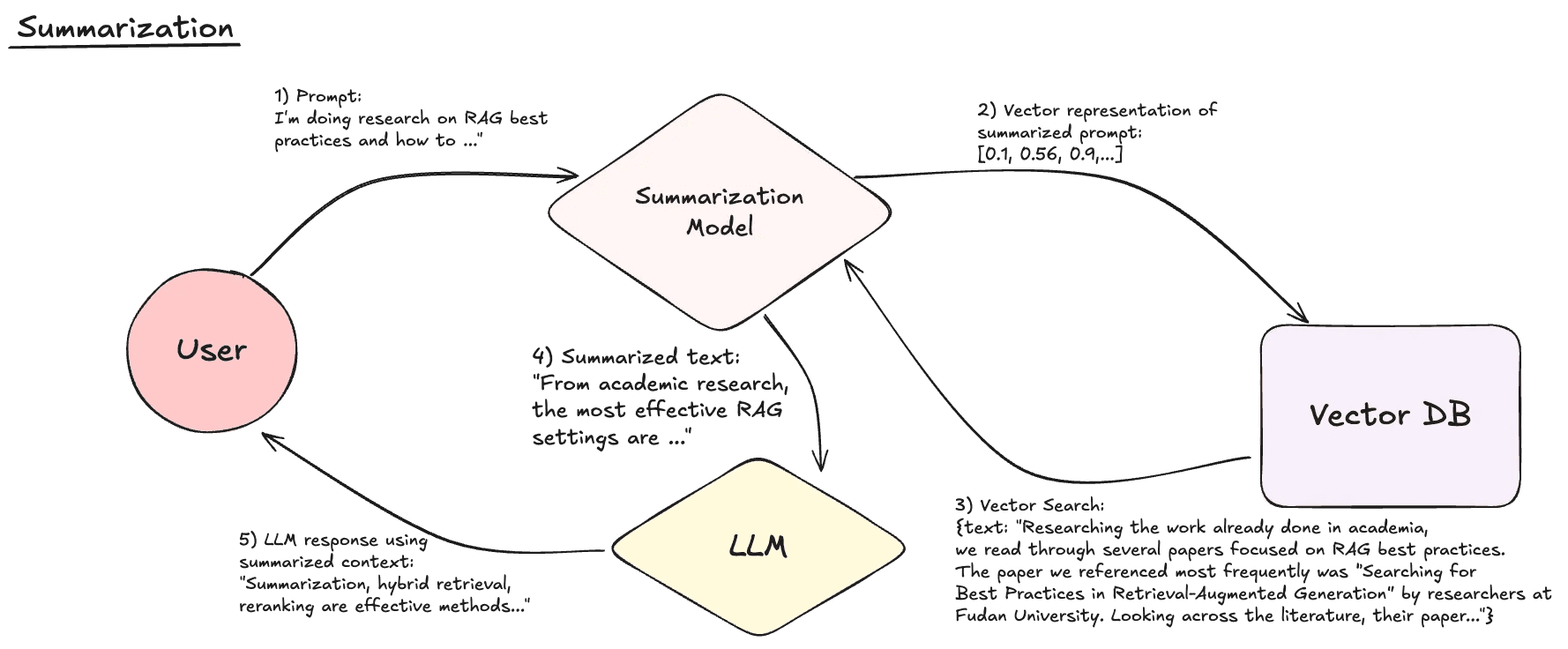 Summarization is what it sounds like, compressing prompts or context into shorter text using an intermediate model to cut noise and better focus on relevant information. This is especially useful to solve the “lost in the middle” problem where details in the middle of a longer text can be ignored by an LLM, similar to how people tend to remember the beginning and/or end over the middle (primacy & recency bias).