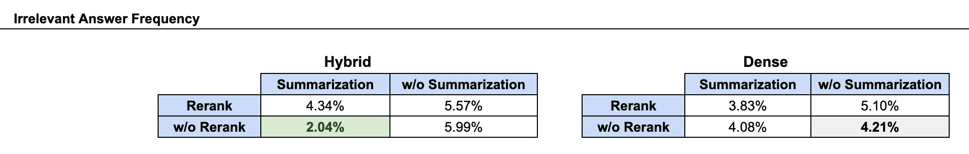 What we found was that hybrid retrieval, without reranking, and with summarization saw the highest performance in average answer relevancy and irrelevant answer frequency. These settings achieved a: