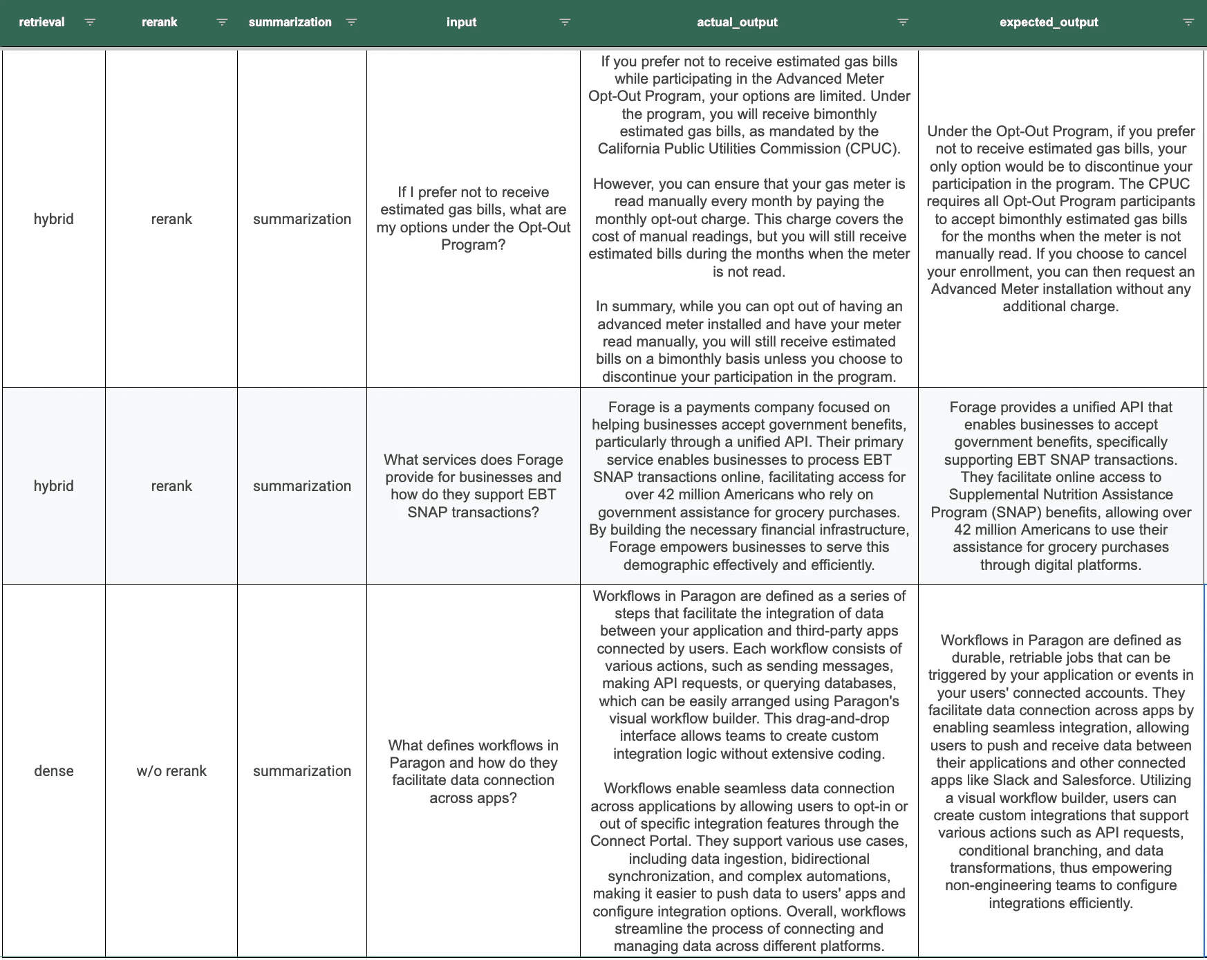 We have the settings combination, prompt input, expected output generated from the synthetic prompt process, and the actual output generated from the RAG workflow.