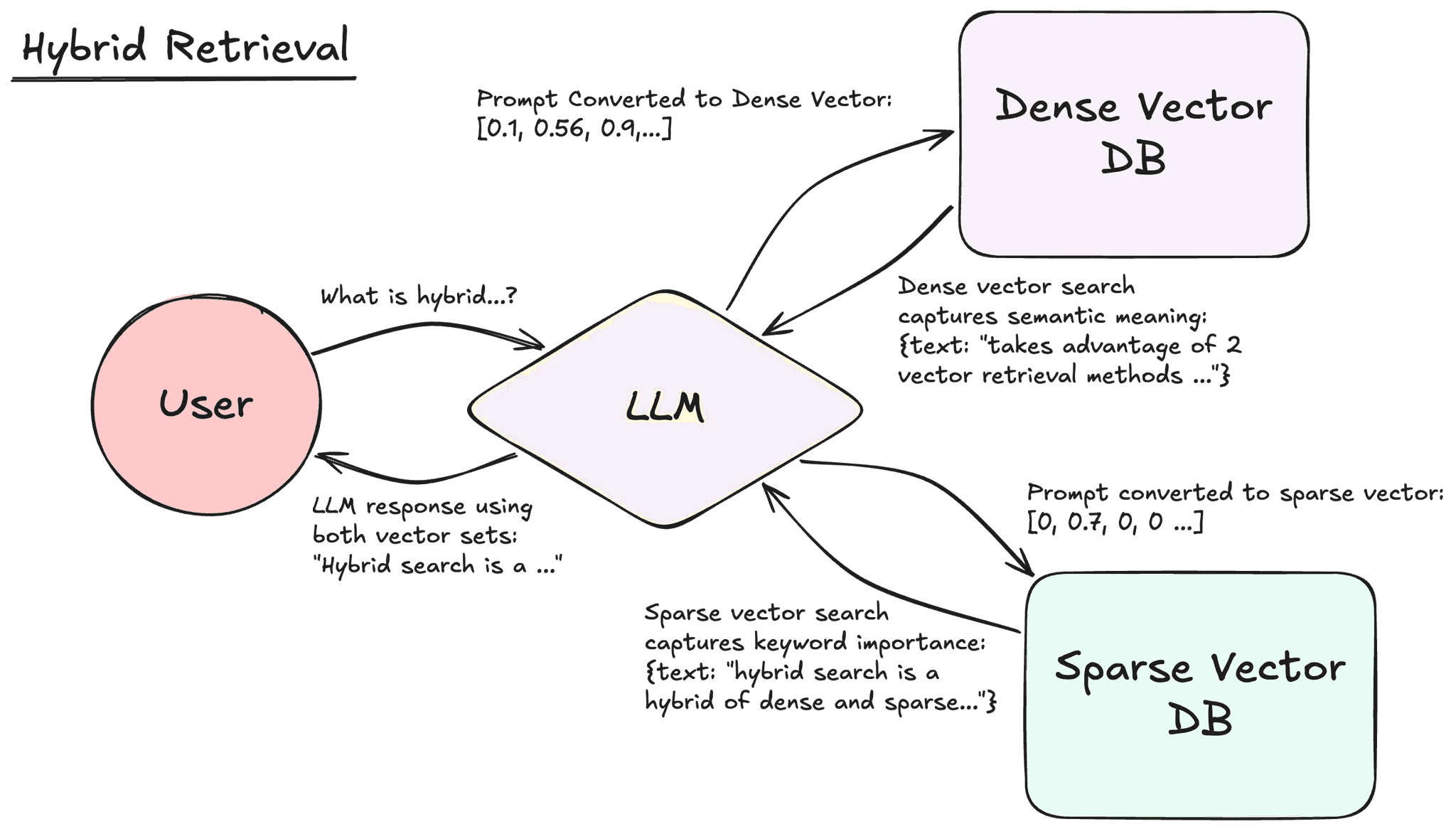 Hybrid retrieval uses both dense and sparse vectors to search, thus taking advantage of semantic as well as keyword search.