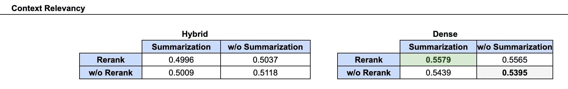 To provide more context in our RAG workflow methods, we wanted to share our implementations of hybrid retrieval, reranking, and summarization.
