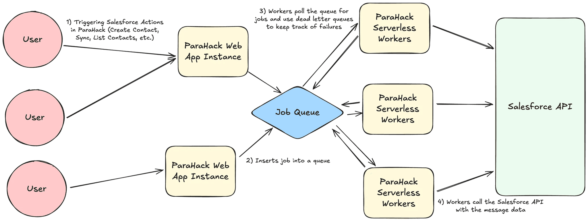While I didn’t implement a different pattern for the initial data ingestion use case as I wanted to focus on data synchronization, this pattern would not work well for an initial data pull. Imagine a user newly integrates their Salesforce with ParaHack. That first initial data pull may import tens of thousands of contacts especially if the user is a part of an enterprise or their Salesforce is decades old (recall the GET /services/data/v62.0/query/?q=SELECT+FIELDS(STANDARD)+from+Contact endpoint).