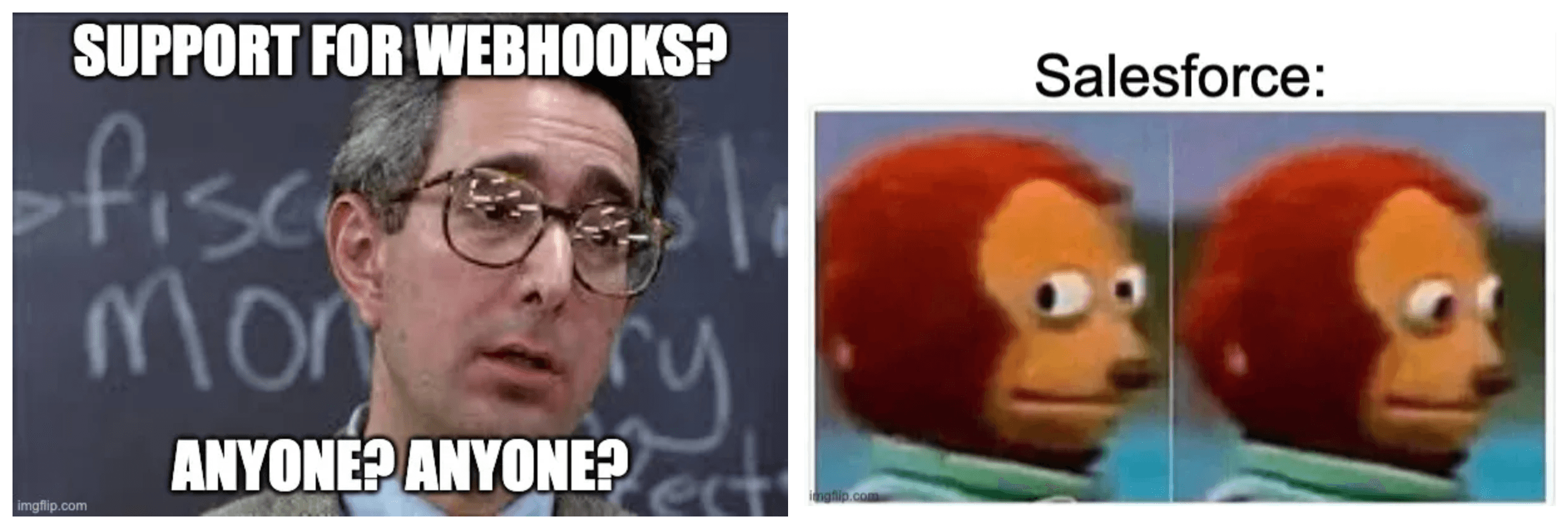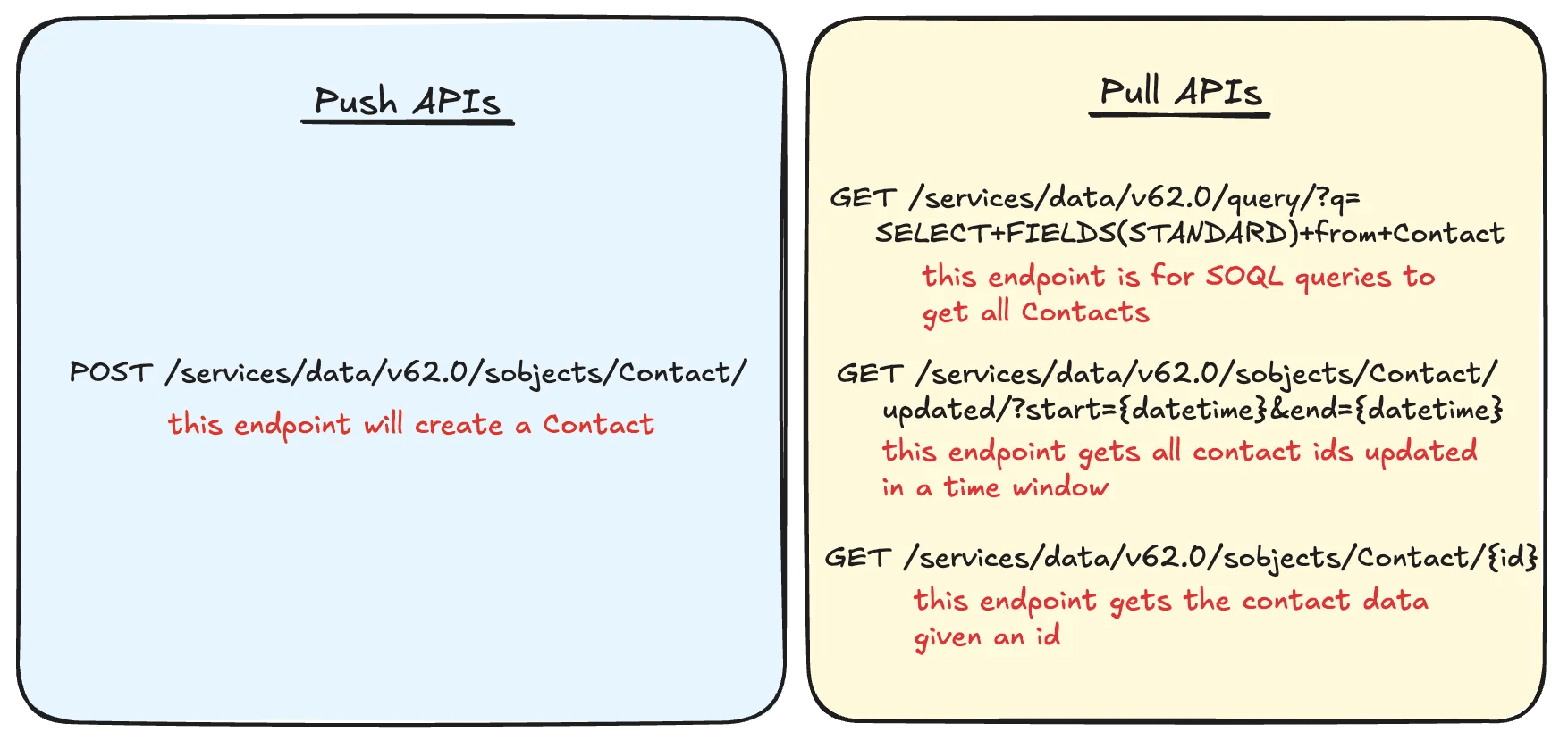 Where it got a bit harder to decide on a pattern was for real-time data pulls. While I personally would have liked a more event-driven pattern where an event is sent whenever a contact is created in Salesforce, I didn’t find a clean method that supported this in Salesforce's API.