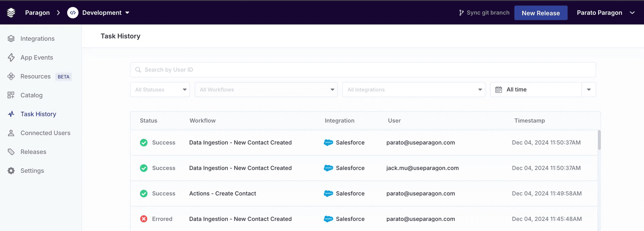 Building with Paragon, I didn’t need to worry about polling windows as Paragon enables webhooks, simplifying the process tremendously. Similarly for rate limits, Paragon has a mechanism called Smart Rate Limits. They abstract the process of working under rate limits with their workflow engine, helping me make sure my application didn’t trip up Salesforce rate limits while giving me visibility on what workflows have been run, what user they ran for, and individual task statuses as well.