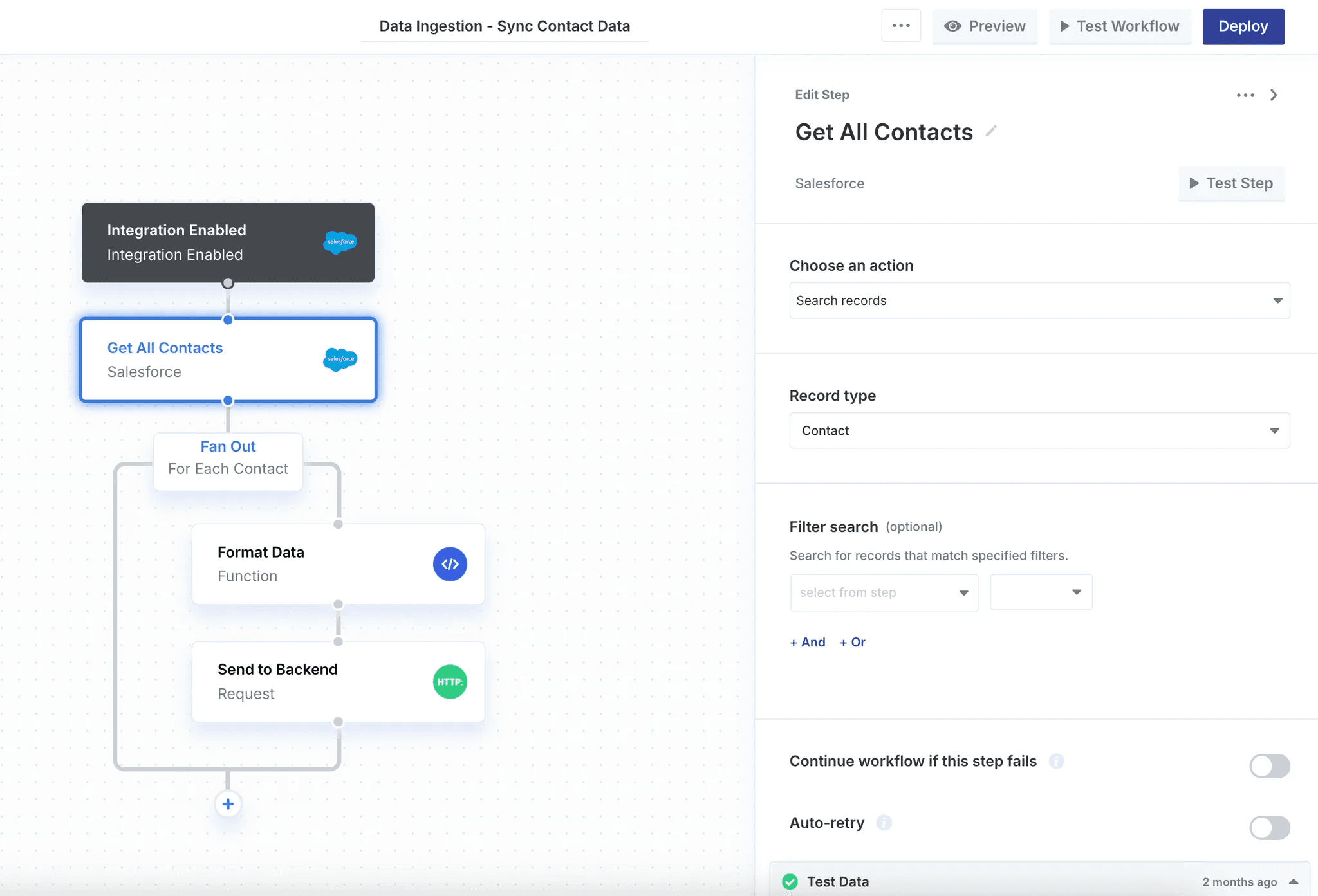 Paragon was built for multi-tenant applications in mind. Paragon’s workflow engine allows workflows to be triggered by multiple users concurrently, and further allows for parallelization within workflows. In the example below, I used a “Fan Out” step to parallelize by contact, meaning each contact will enter a queue and be picked up by concurrent workers that will perform a data transformation step and subsequent API call.