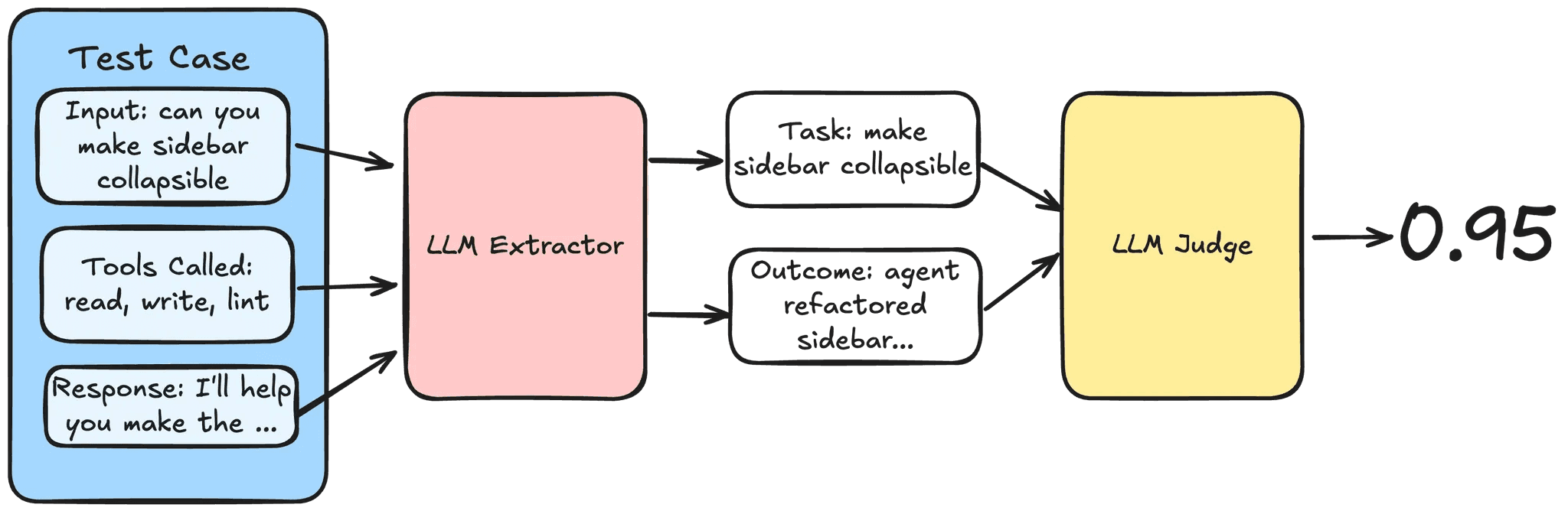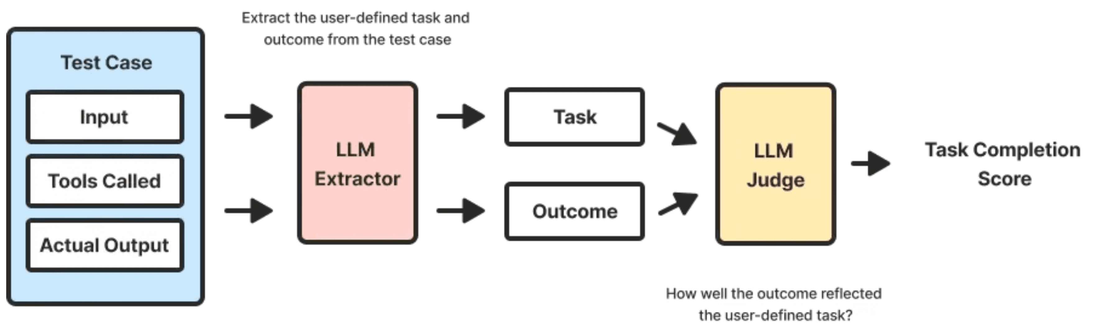 Task completion assesses end-to-end success on the prompted task. An LLM judge (while a bit subjective) provides the score that quantifies to what extent the job was completed using tools. Here is DeepEval’s methodology for task completion (1).