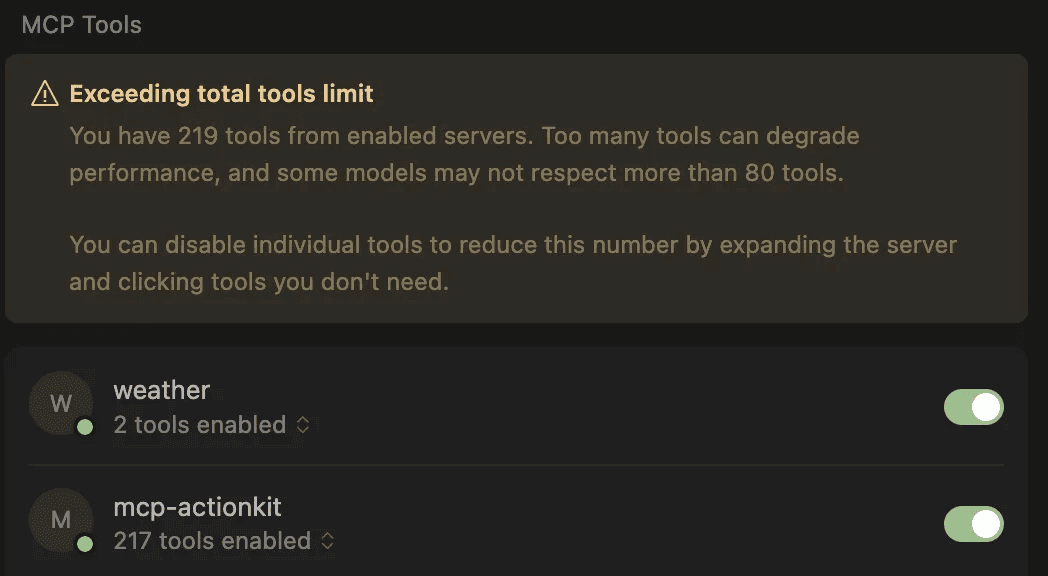 Letting users decide what tools to give your agent not only limits the number of tools, but also makes it apparent to your users what tools are available.
