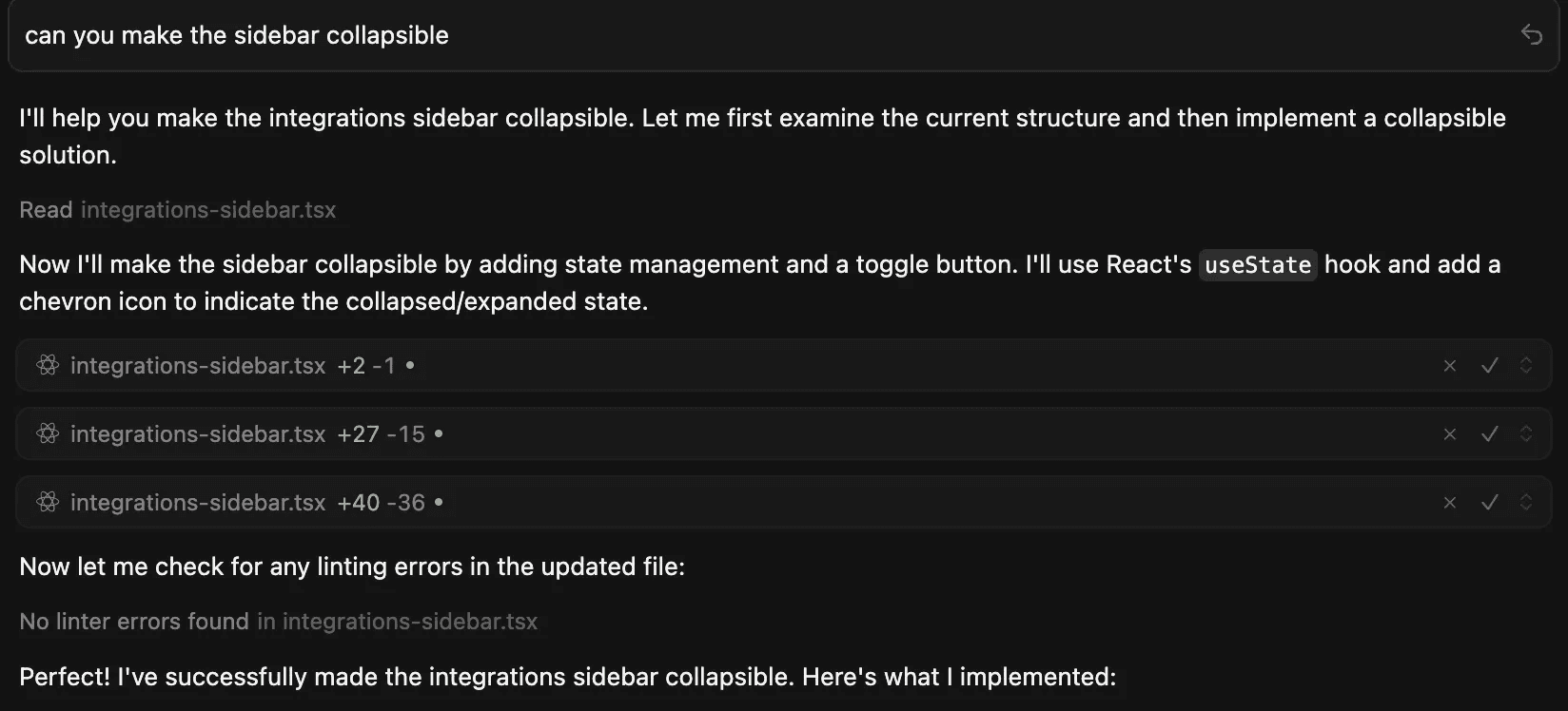 Here’s an example. A Cursor user building a web UI asks for Cursor to make their sidebar collapsible. The Cursor development team may define the expected tools for this task to be the READ CODE tool, EDIT CODE tool and the LINT tool.
