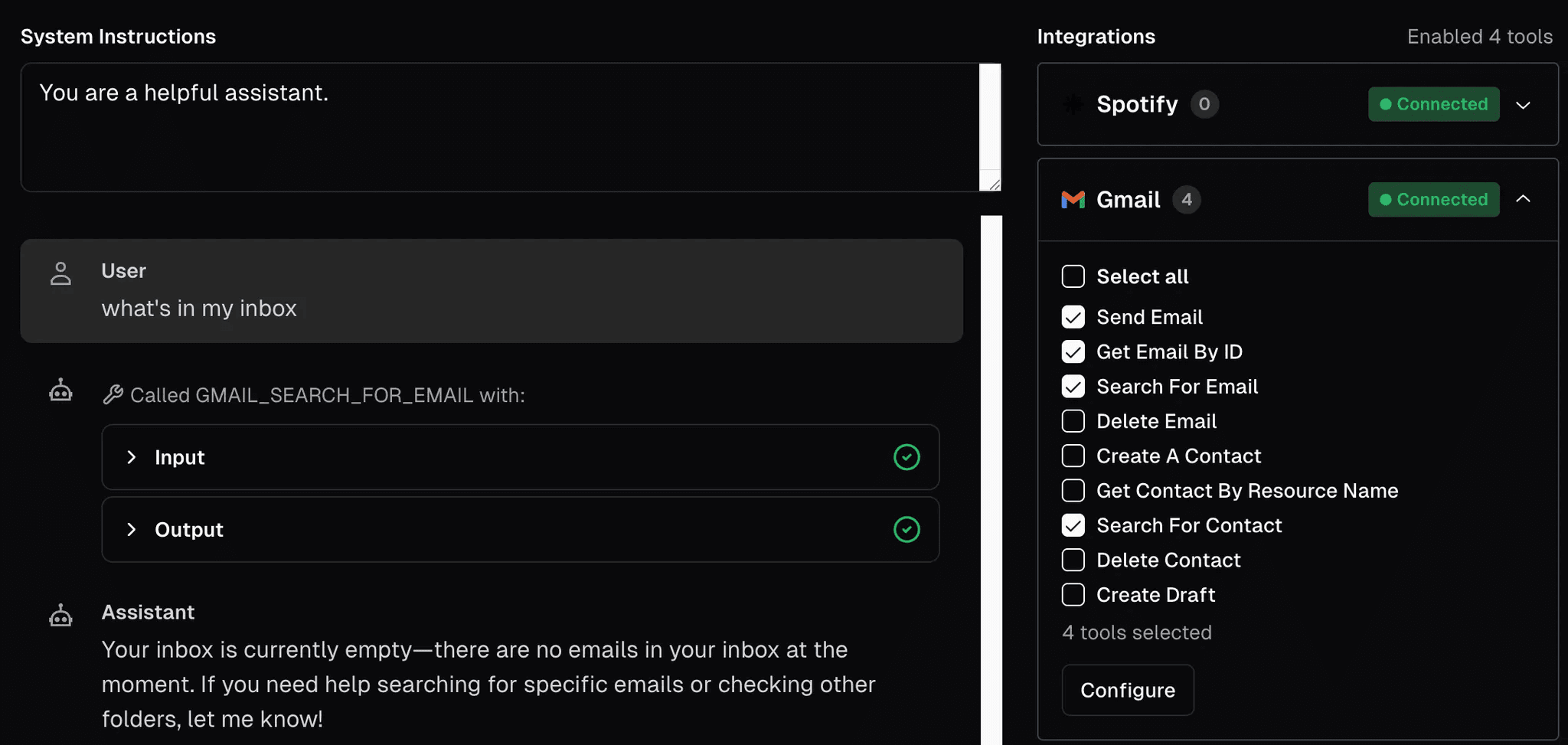 Based off the plan with a list of integrations, ActionKit builds tools dynamically - providing the right descriptions and input schema for different actions across an integration like Gmail.