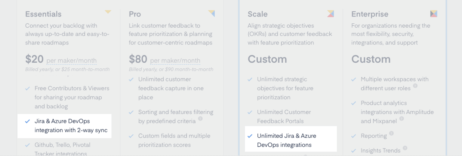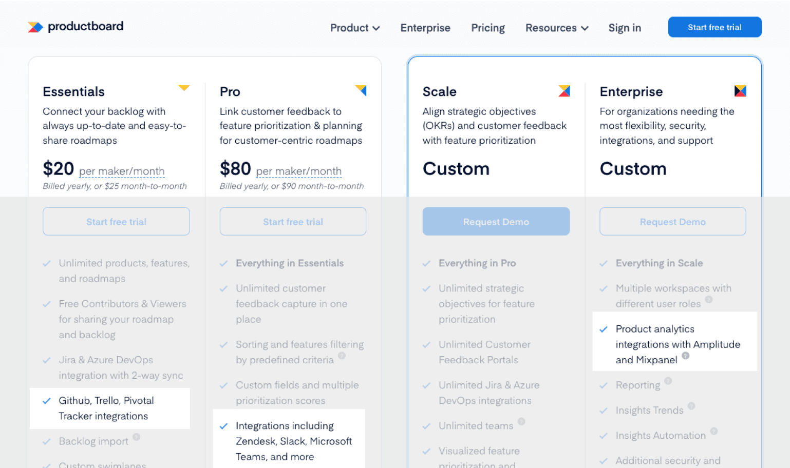 In this example with Productboard, they’ve grouped communications integrations into their Pro tier, and product analytics integrations into the Enterprise tier. This is because the product analytics integrations provide immensely valuable insight that no other product in their category provides, whereas the communications integrations offer relatively simple functionality.