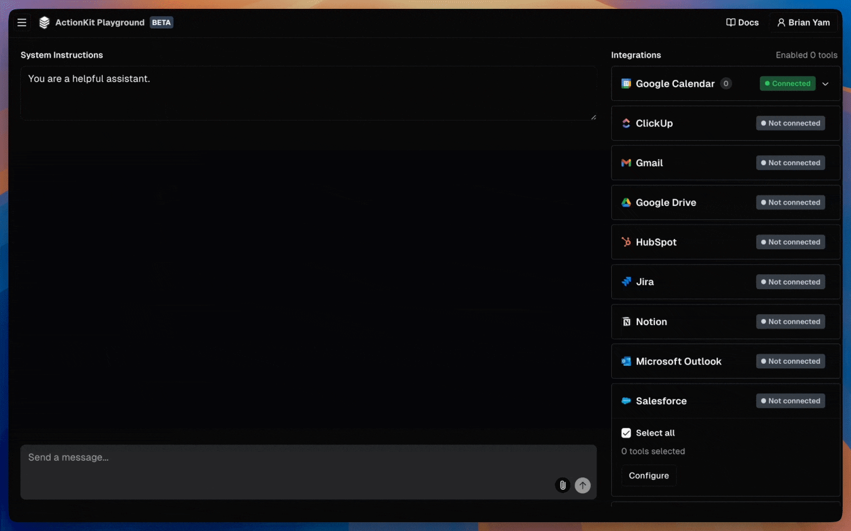 This is just a basic example to demonstrate the capabilities that ActionKit can provide to your AI Agent - if you're interested in trying out the ActionKit Playground for yourself, get access by booking some time with us here!