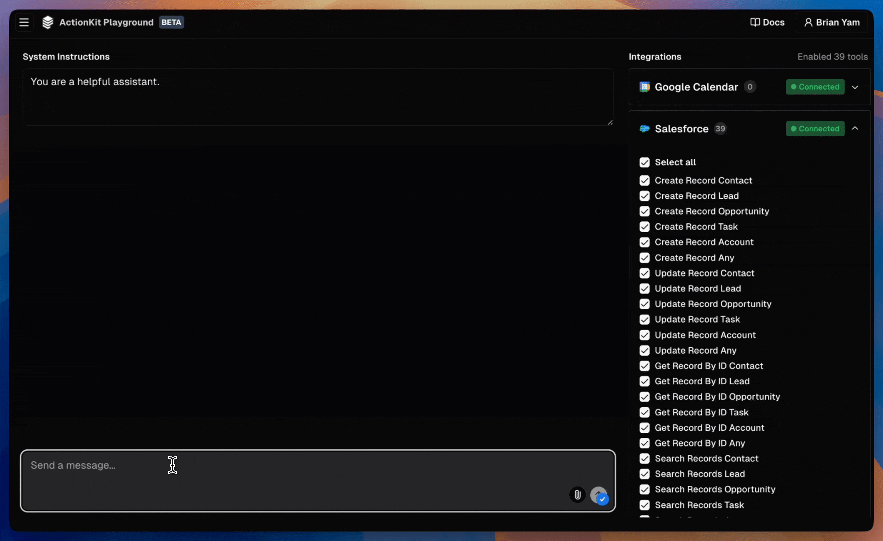 We built ActionKit Playground to help showcase ActionKit in action. To demonstrate a simple example, we can instruct our playground’s agent to act as a useful sales assistant, and prompt it to retrieve and update CRM records from Salesforce.