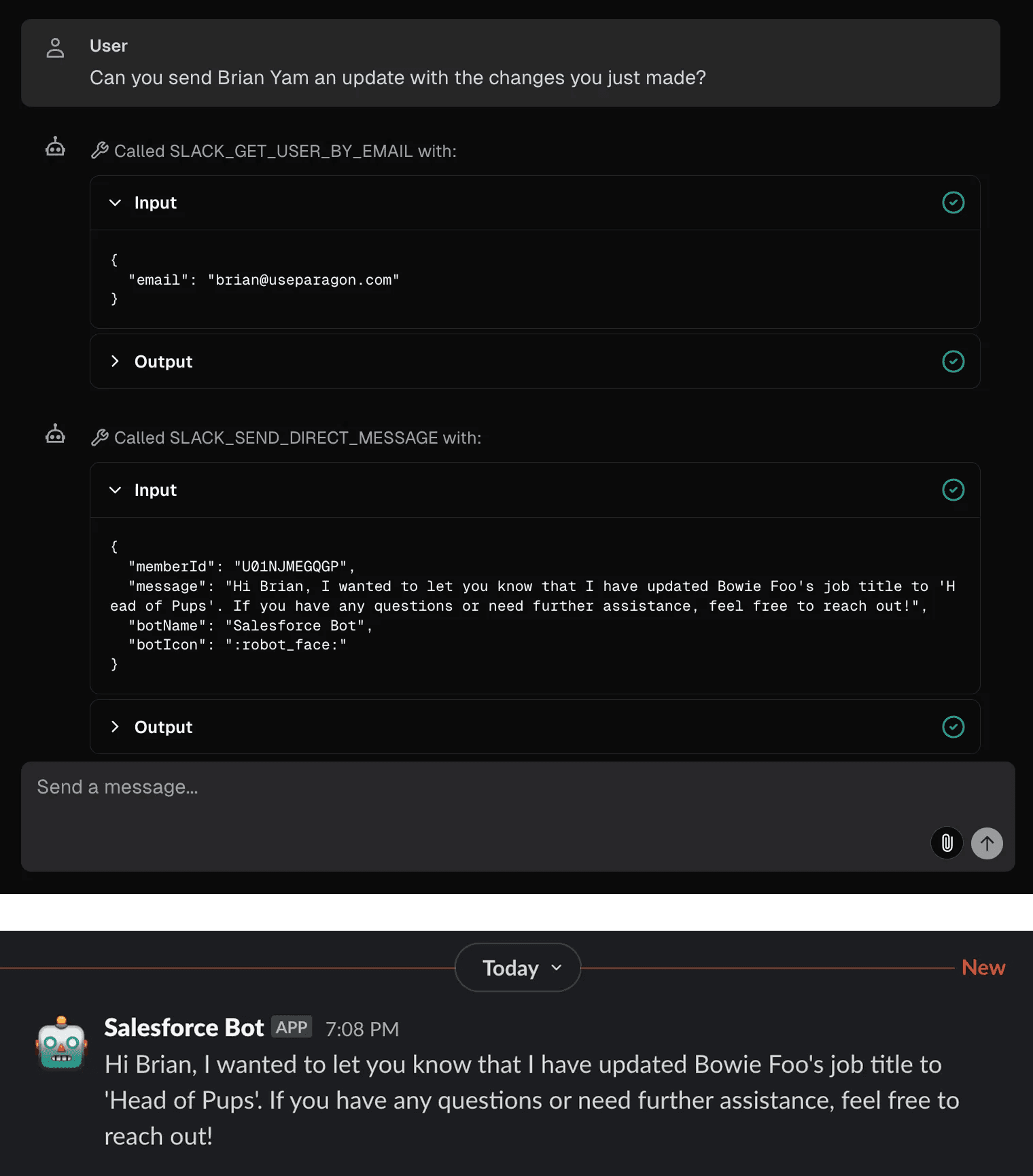 We can then prompt our agent to send a message in Slack summarizing the changes it made in Salesforce. Our agent uses ActionKit again to select the relevant Slack integration action (Send message in channel).