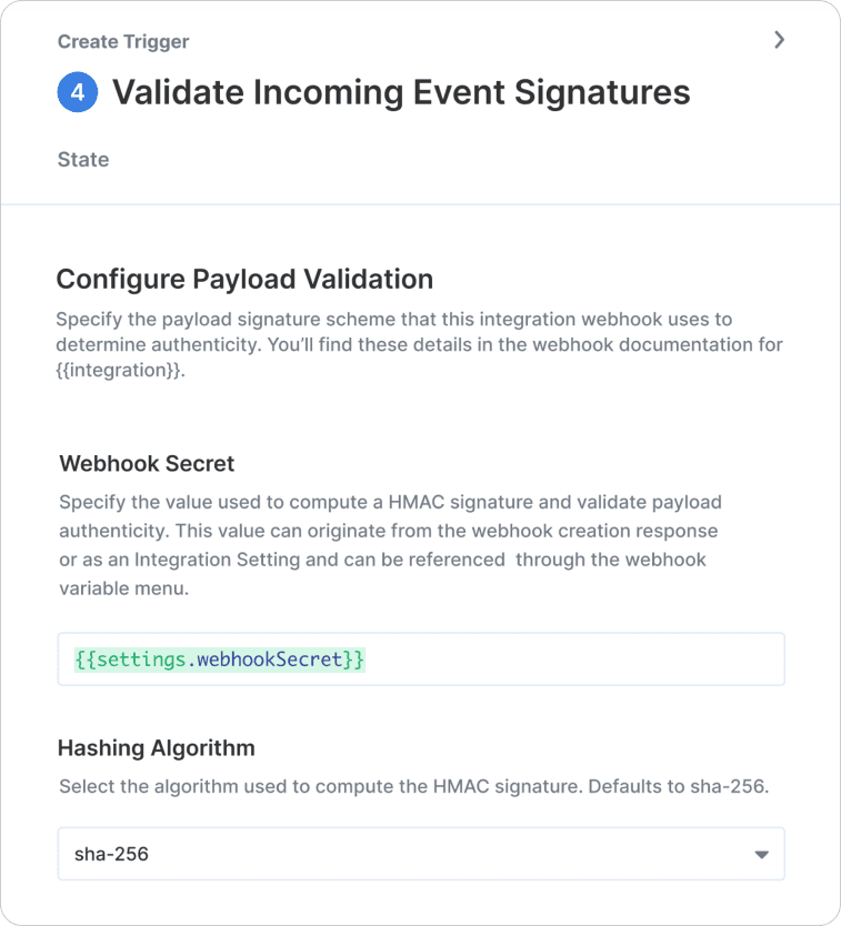 Security: Security is also a huge challenge with webhooks because your webhook listeners may be susceptible to unauthorized requests if the endpoint is exposed. To prevent that, you’ll need to implement handshakes to validate the authenticity of the incoming webhook payload. With Custom Webhooks, you can easily specify the webhook secret and hashing algorithms that are required to generate the necessary HMAC (Hash-based Message Authentication Code) for each webhook.