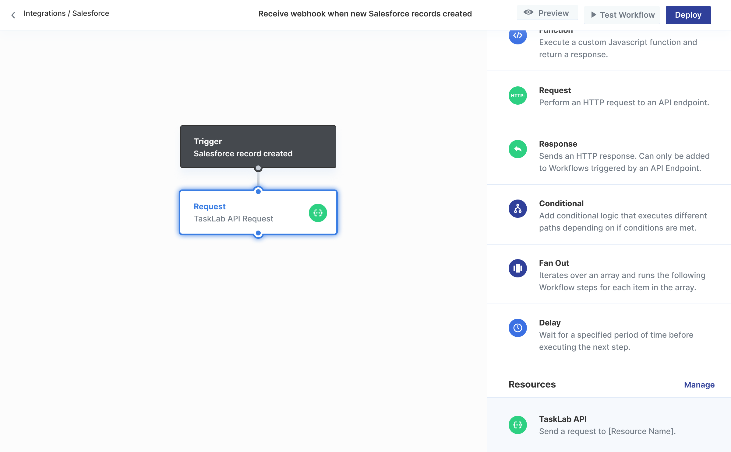 Instead of using our generic HTTP request step which you need to configure for your own API for every workflow, you can now use the Resource step which has all the details (auth, base URL, etc.) pre-configured.