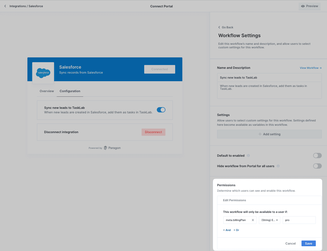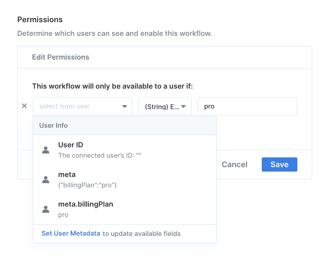 Whether you need to upsell your customers with deeper integration use cases or your solutions team needs to build customer-specific integration logic for enterprise customers, Workflow Permissions enables you to surface integration use cases programmatically based on user metadata.
