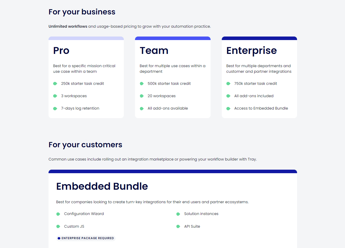 Tray.io Embedded is now offered as an add-on exclusively for Enterprise customers. To access this feature, businesses must subscribe to Tray.io's Enterprise plan, which includes 750,000 starter task credits and provides access to all add-ons, including the Embedded Bundle.