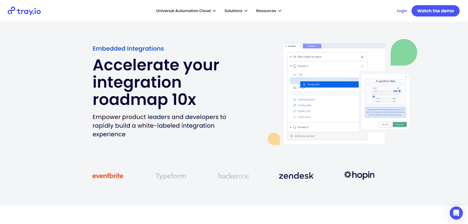 Tray.io Embedded is a re-packaged version of its main platform, Tray.io. This version specifically targets the embedded integrations use case, enabling SaaS companies to build and manage embedded integrations for their users.