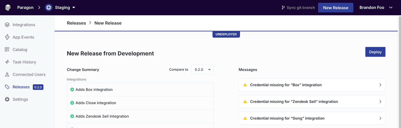 Paragon takes it a step further by highlighting the changes made between versions and surface relevant warning messages from the changes introduced (such as users needing to re-authenticate due to changes in OAuth scopes, etc.).