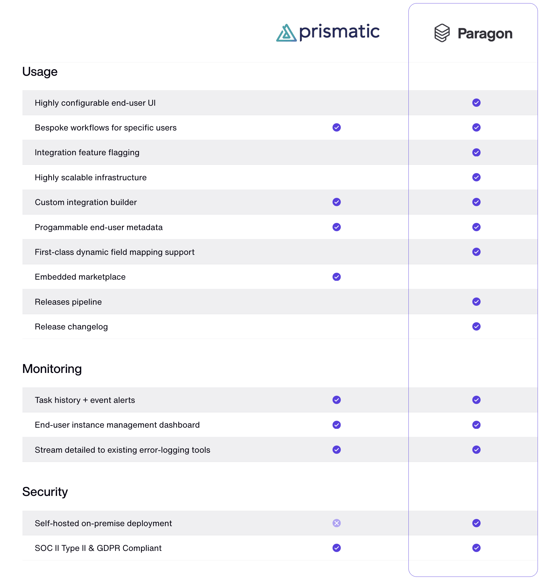 ➡️ The top Prismatic alternative is Paragon. While Prismatic and Paragon seem to offer similar products on the surface, Paragon provides a much more robust and cohesive end-to-end developer experience for building, releasing, and maintaining integrations for SaaS products.