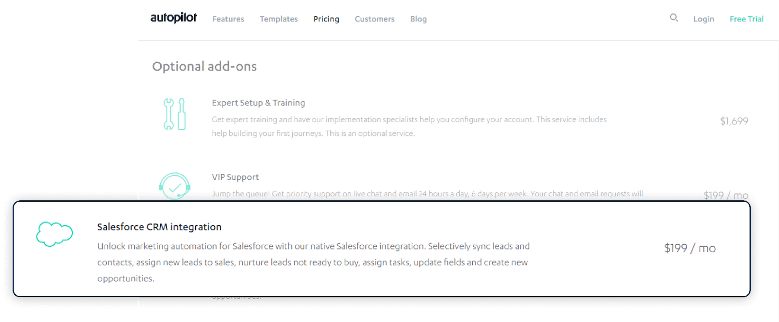 Here’s an example with Autopilot, who has included most integrations as part of their out-of-the-box offering but decided to specifically provide Salesforce as a separate add-on. Strategically, this makes a lot of sense, as companies that would use marketing automation in conjunction with Salesforce are most likely to be in the mid-enterprise stage, and would be willing and able to pay for the integration.