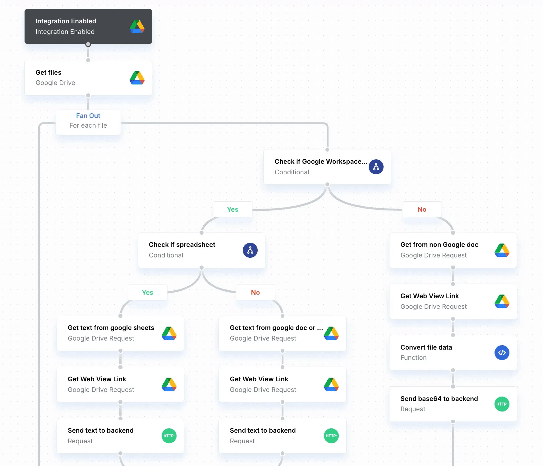For a use case where your application needs to access, process, and index all the data in your users’ external system, such as all the records in your customers’ CRMs, all the transcripts from their Zoom, or all the files in their Google Drive (this is similar to many RAG and AI use cases), an asynchronous implementation is necessary. Take the Google Drive example below - you need to get all the files from your users’ Google Drive, which requires you to traverse through many potential subfolders. For an enterprise organization, this could mean ingesting tens of thousands of files - an operation that could take minutes or even hours to complete.