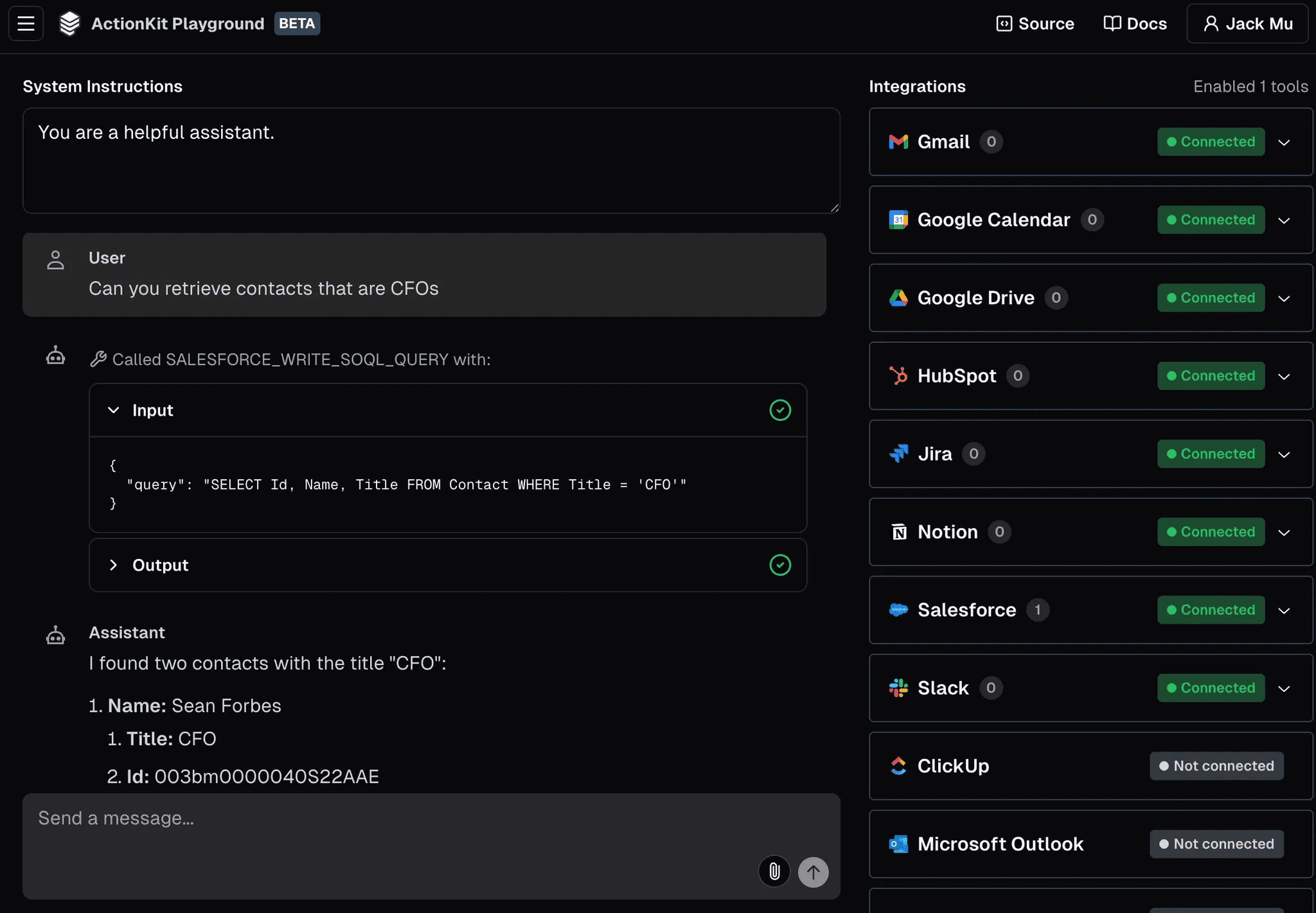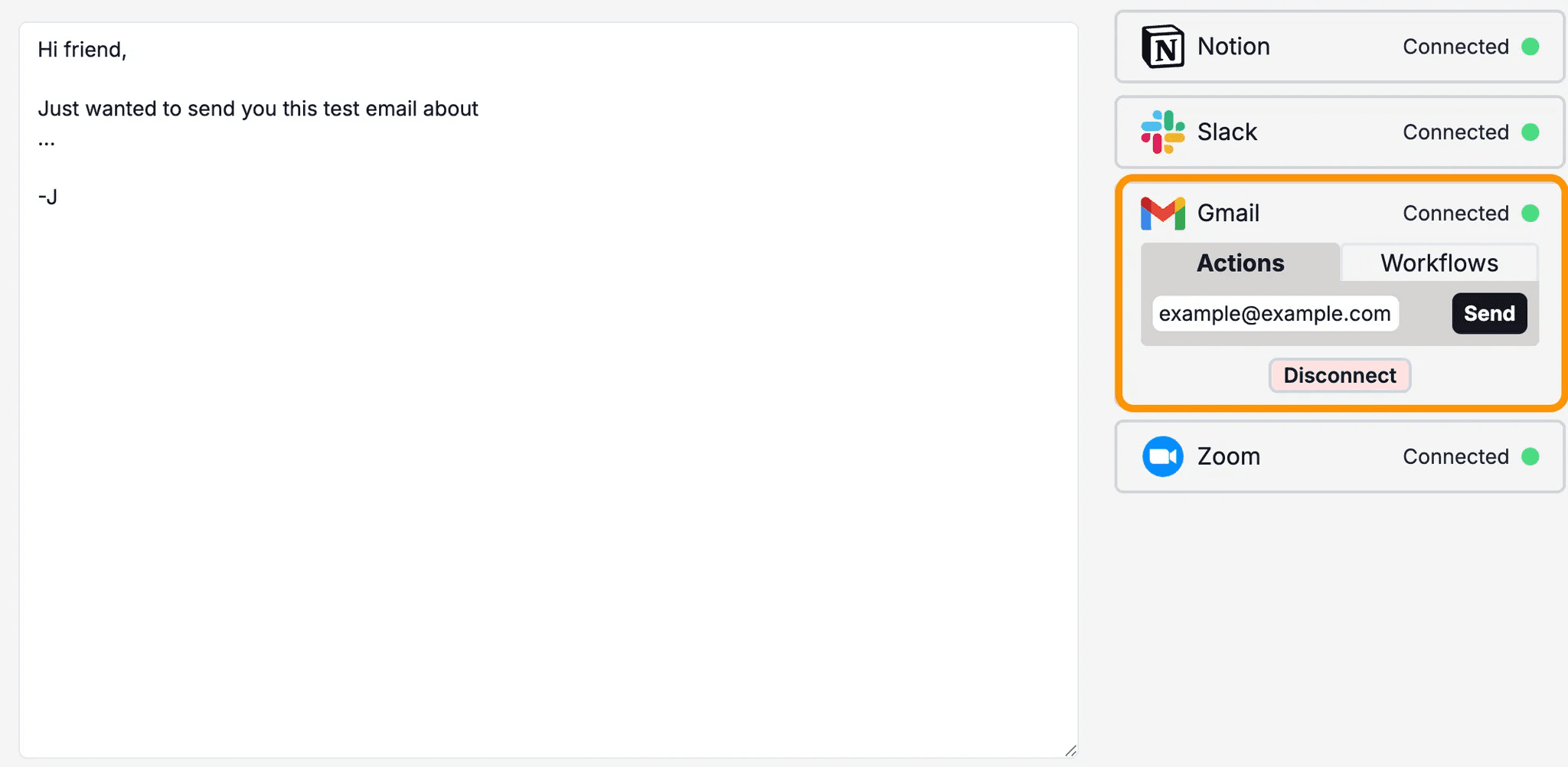 Useful operations like getting Notion page contents and getting Google Calendar availability are provided (these actions are useful abstractions on top of the 3rd-party API)
