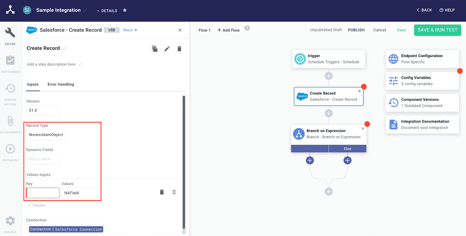 In the screenshot above, you can see that Prismatic's pre-built Salesforce connector has a "Create Record" action, but it only allows free-text input for record types and doesn't offer a way to reference the fields contained within those types. As a result, engineers still need to refer to Salesforce API documentation to understand object types and field types, rendering the API abstractions and pre-built actions less effective.