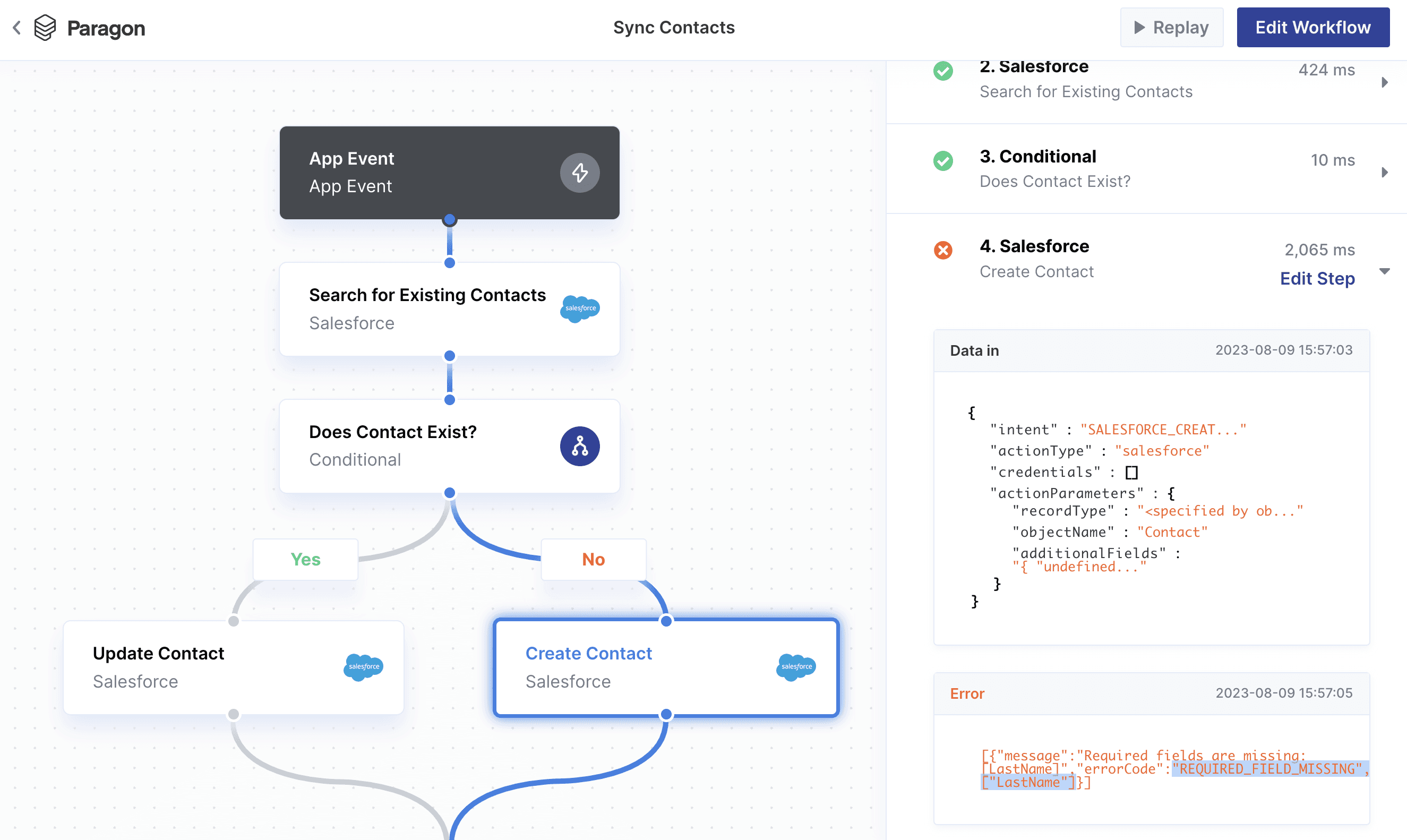 Paragon provides full observability into every step execution, which makes it extremely easy to test workflows as your team builds the integration, and equips your team with the best visibility for debugging errors when they occur.