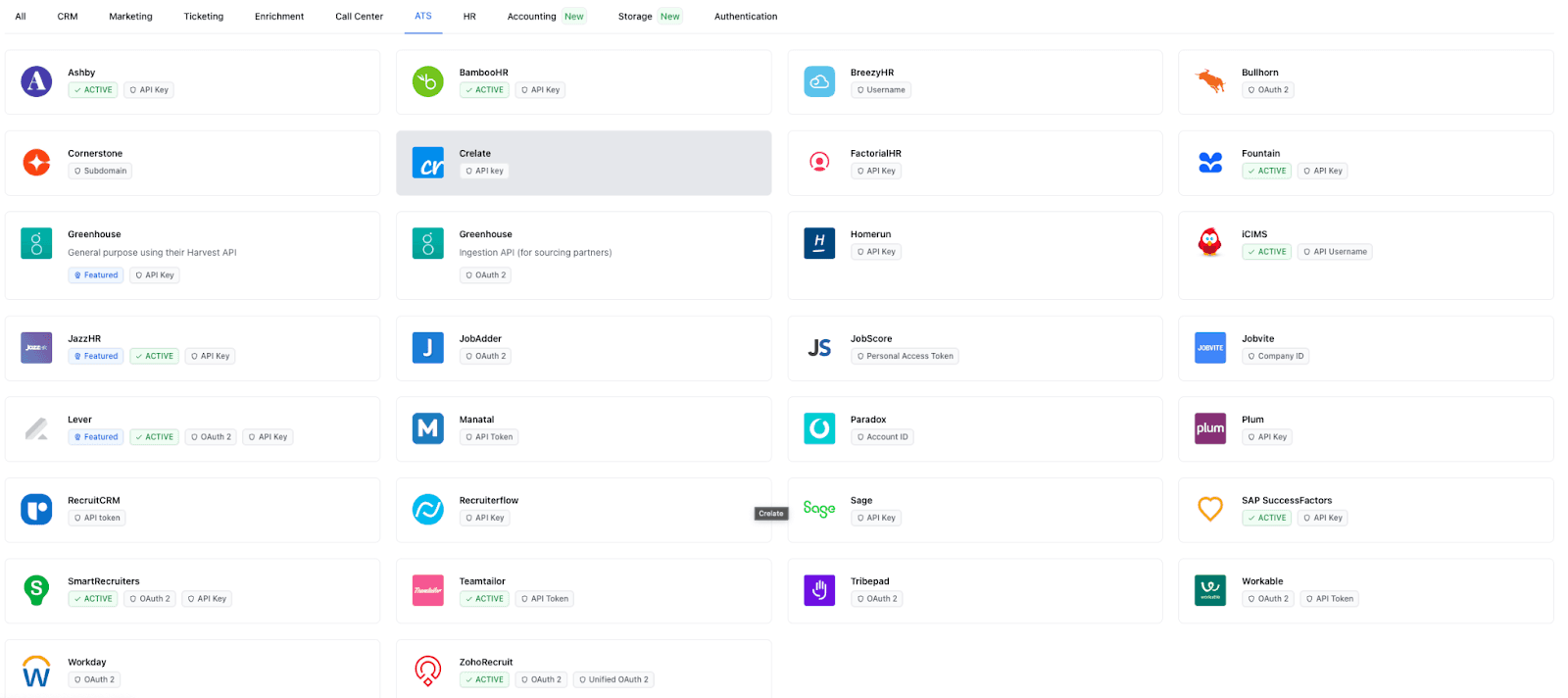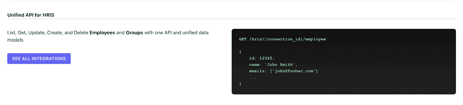 ▶️ The solution now offers connections to over 200 third-party apps. While it currently only has seven unified APIs, it provides the best coverage for each category among other unified API solutions on this list., especially in the HRIS and ATS categories.