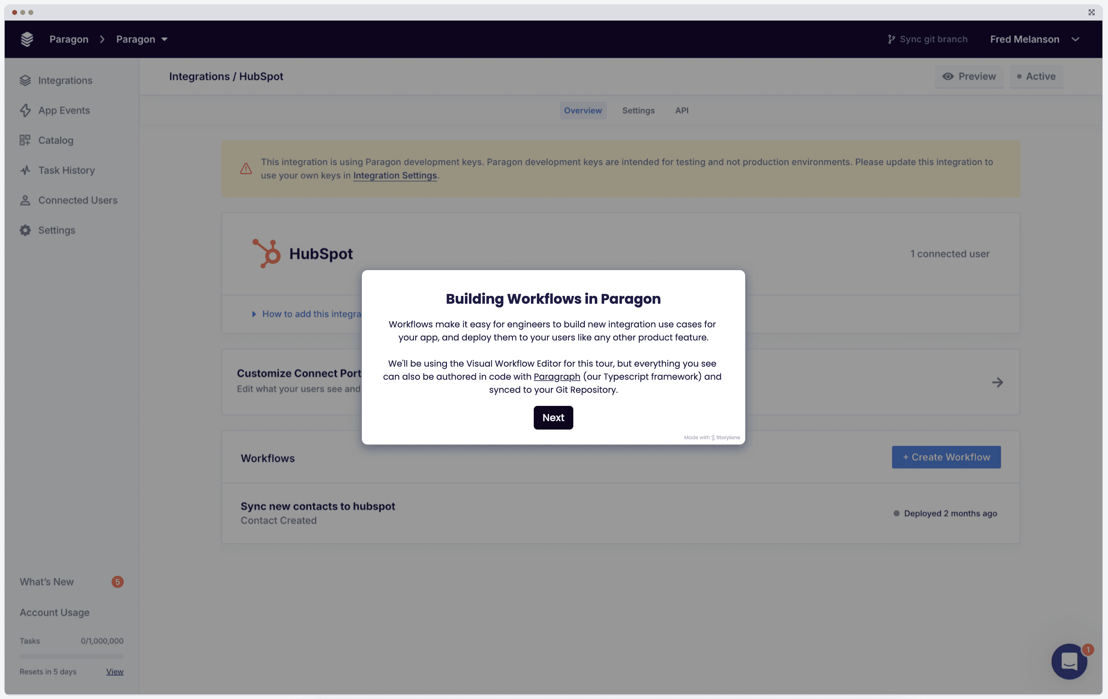 One of the core components of Paragon is Workflows, which lets you easily define the business logic for your product's integrations.