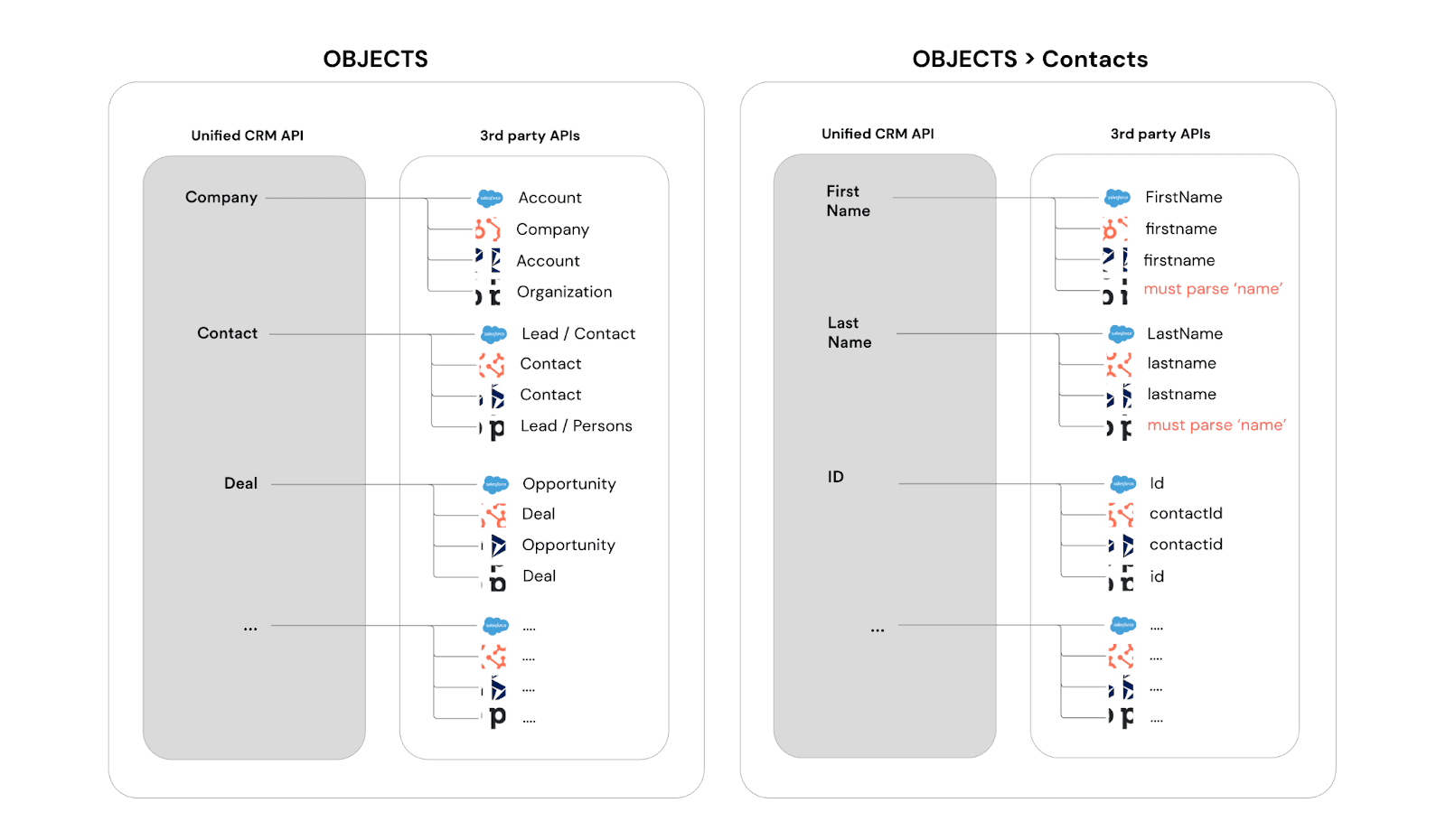 One app in the unified API has an object or field that the others don’t, such as Salesforce having lead/contact objects that behave differently than the single contact objects of other CRMs like HubSpot.