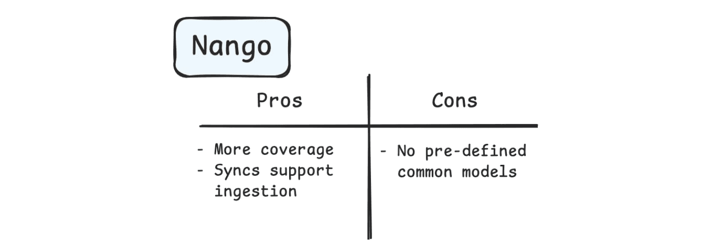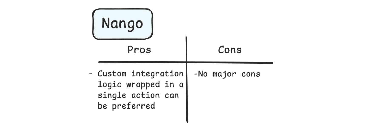 In some ways, this is nice because Actions and Syncs in Nango behave exactly as you need for your unique use case. But for general use cases (non-niche), this design can be overkill.