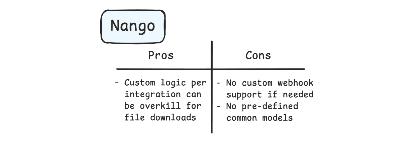 Nango also supports file syncs, downloads, and uploads. Like building in Nango in general, building integration logic is quite involved since Nango doesn’t provide abstractions for you.