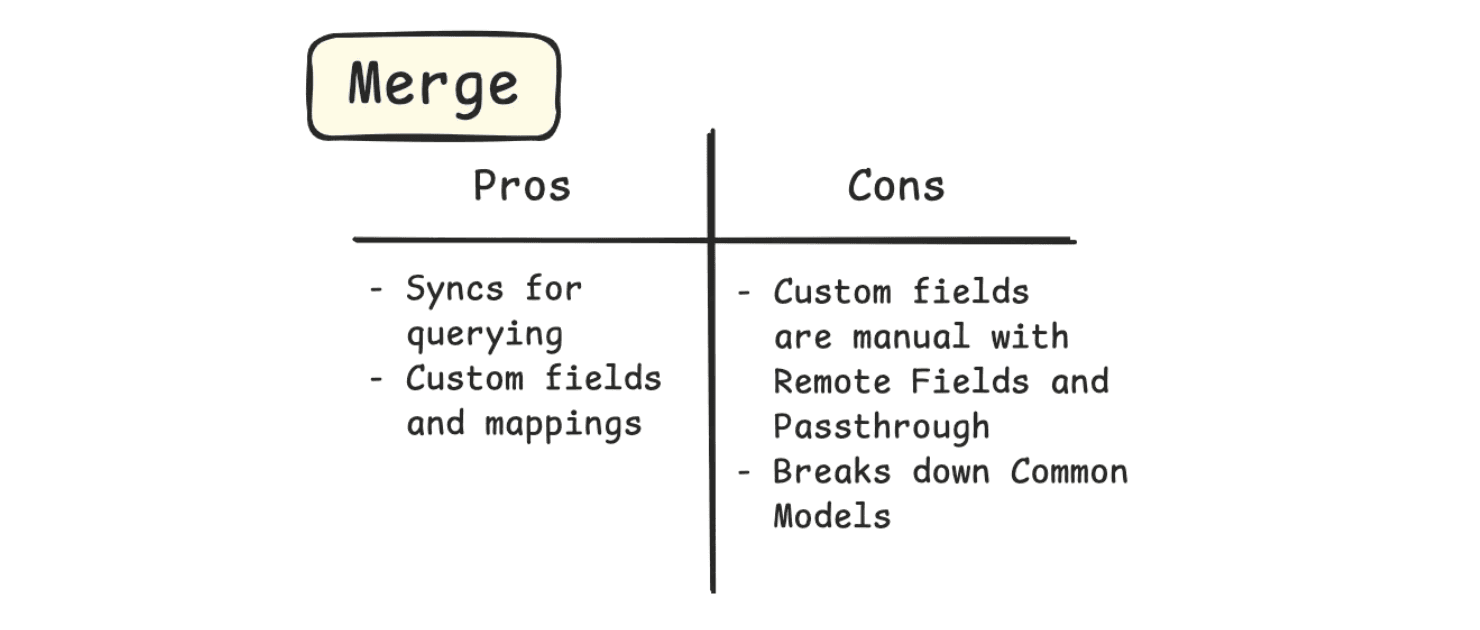 What Merge offers instead is Remote Fields, which are fields not in the common model that they still support via syncs. For any additional integration data that can’t be accessed via the common model OR the remote fields, Merge also offers Passthrough or proxy to make requests directly to the integration API.