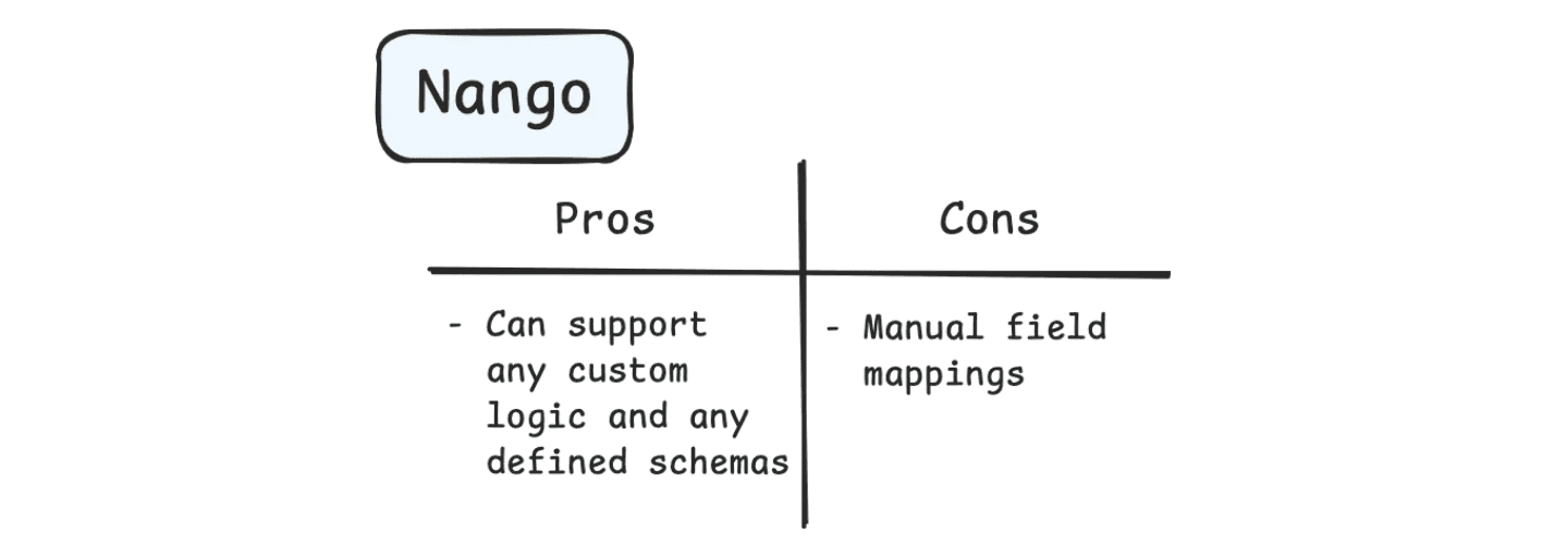 We recommend Nango for use cases that are more custom logic intensive, where you may want to call multiple APIs with data manipulations in a single action or sync process.