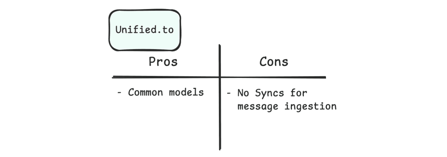 Unified.to can support sending messages and message ingestion as well. But like all of Unified.to’s integration categories, syncs are not supported out-of-the-box, meaning that more engineering resources are necessary if you have a message ingestion use case.