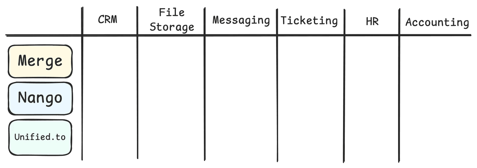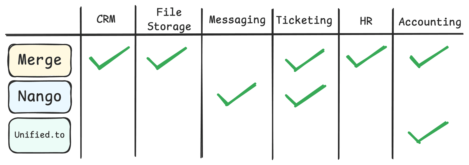 All of this information was sourced from the Merge, Nango, and Unified.to docs. Please visit their docs for the full picture.