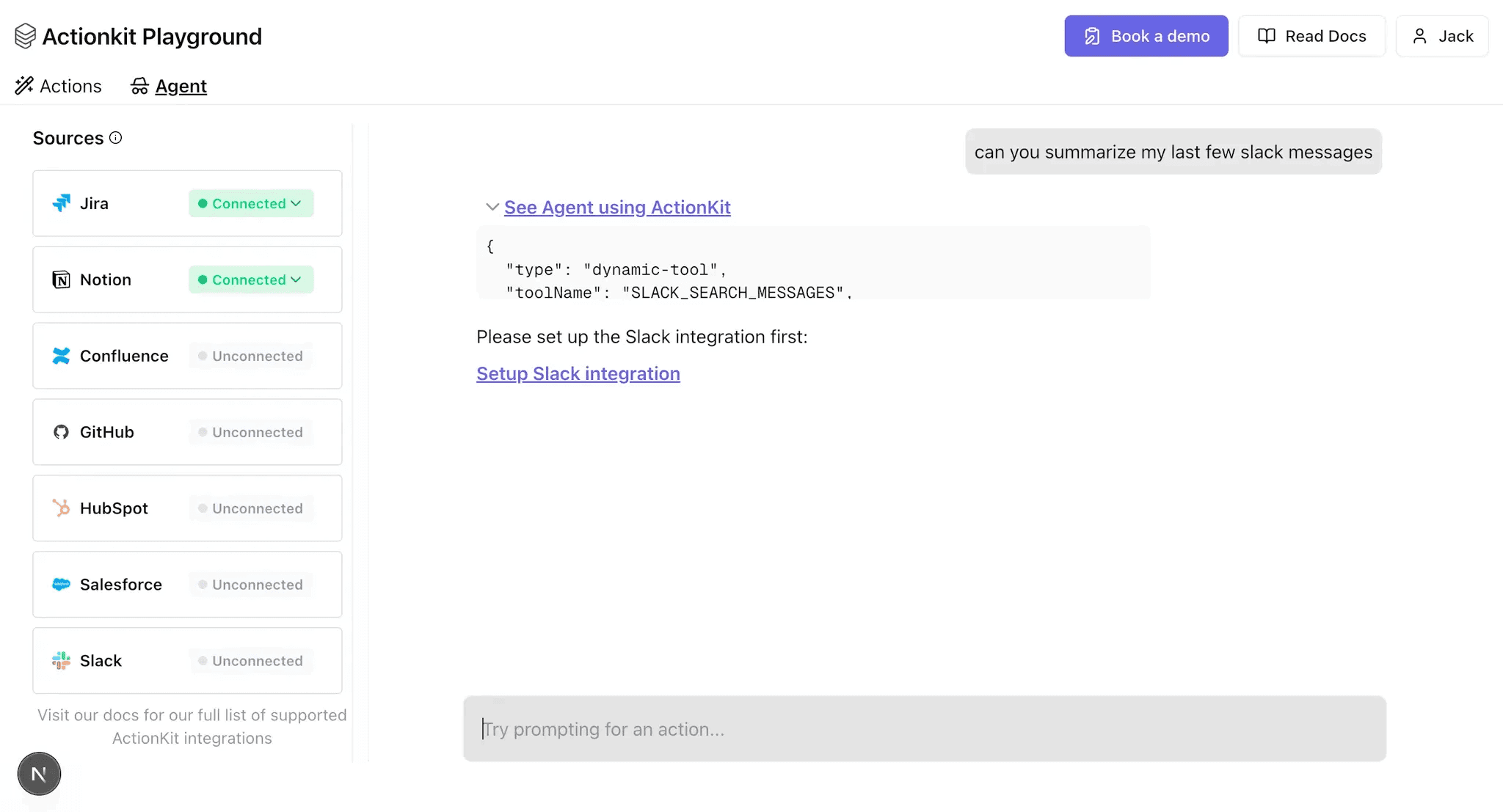 This is in contrast to Merge’s Agent Handler or a product like Paragon's ActionKit. With Agent Handler and Paragon’s ActionKit, you get pre-built tool names and descriptions that are both human and LLM readable. Because these descriptions are optimized for LLMs, you can start running with 3rd-party tools out-of-the-box. We built this Agent Playground in just days with ActionKit.