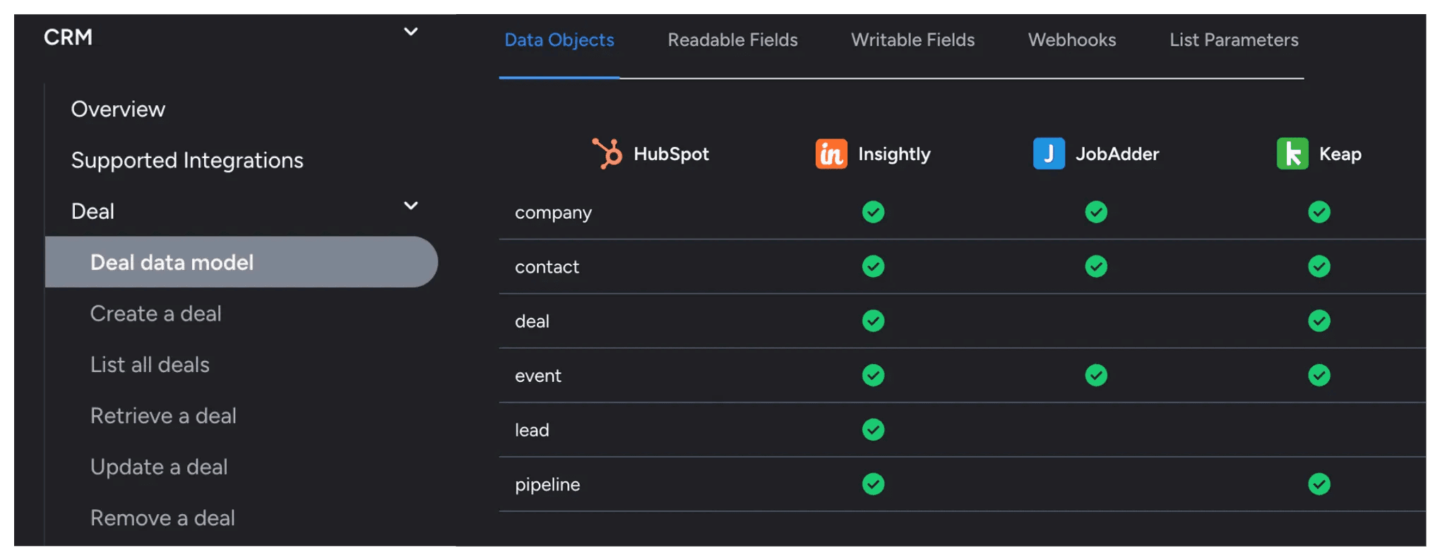 Instead, they have common actions like listing, creating, updating, and deleting their common CRM models that you can use to build your own sync mechanism and ways to query your users’ CRM data.