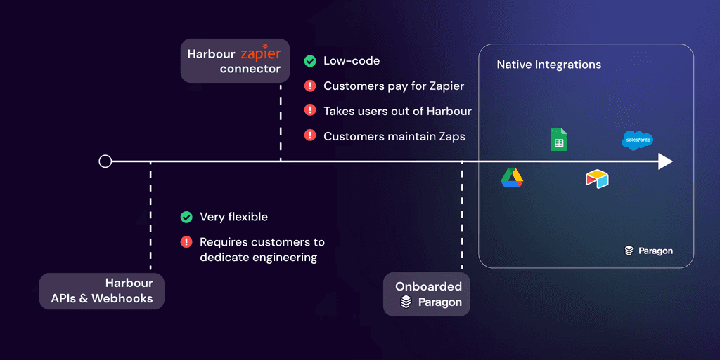 We've seen many of our customers, such as Harbour, take this step-wise approach towards building their integration strategy. Start with Zapier as a temporary measure, but build integrations natively to extract strategic value.
