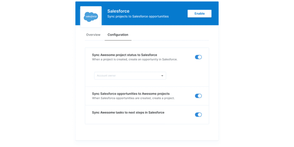 This provides an intuitive self-serve experience for your customers to activate, configure, and customize their integration.